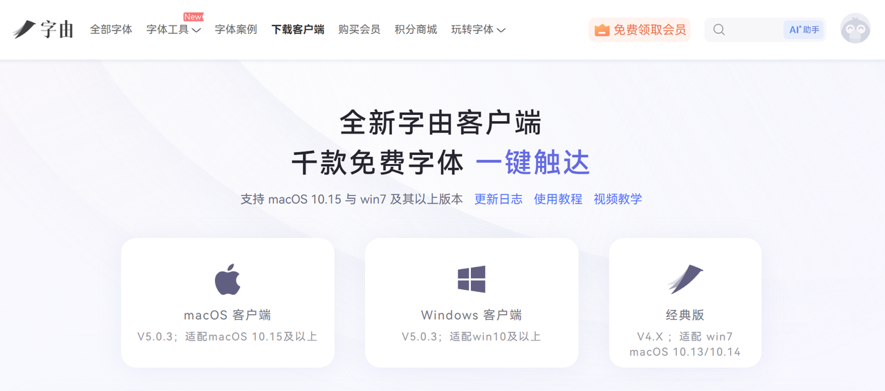 免费字体简单的操作步骤更是差异化亮点,无需将字体下载到本地。接下来我教大家如何下载想要的免费字体,首先,下载并安装客户端。打开字由网(https://www.hellofont.cn/),首页顶端即可找到客户端下载入口。