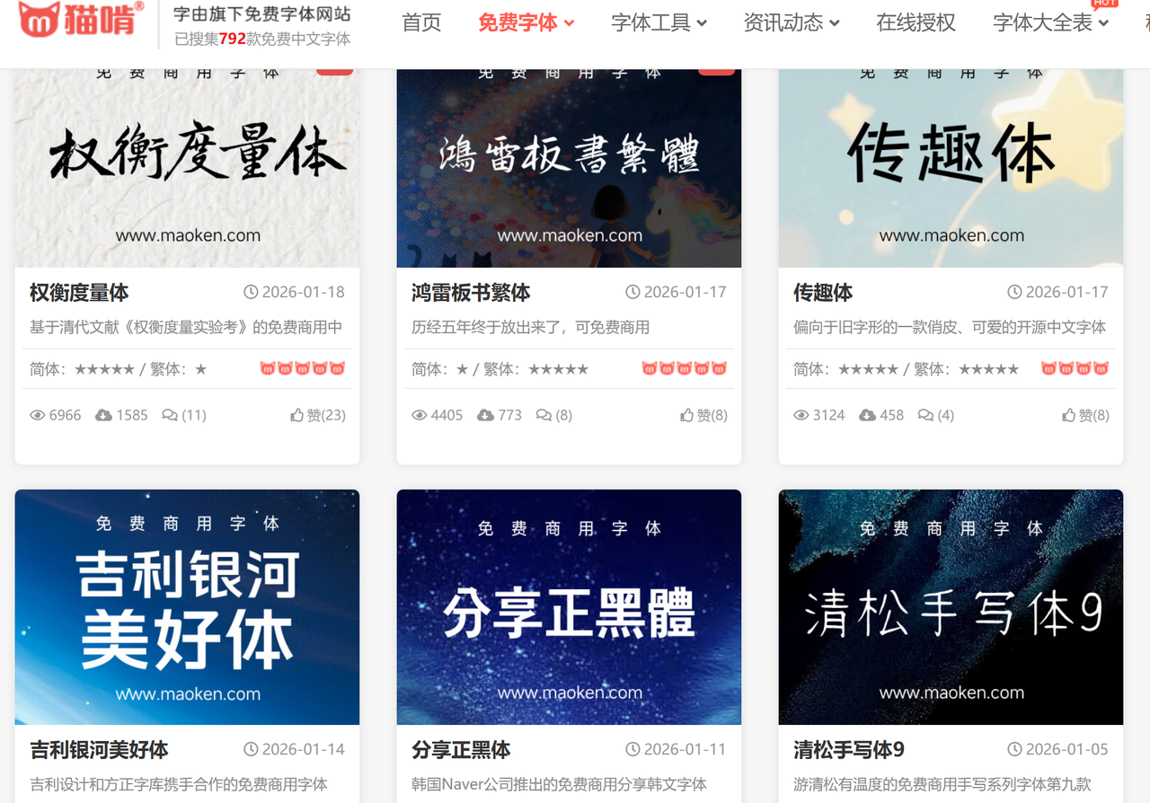 猫啃网是主打免费字体的垂直站点,这里的免费字体更侧重小众化、风格化字体,适合想避开大众字体、打造作品独特性的创作者,所有字体均明确标注免费商用授权。站点免费字体更新频率高,2026年新增多款热门特色字体,比如基于思源宋体改造的香萃积雪宋等。