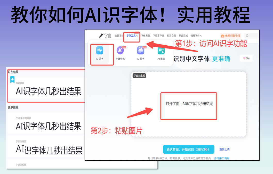 我们可以在浏览器中直接搜索 “字由” 来进入字由的官网,之后在导航栏的【字体工具】区域进入字由提供的 “AI 识字” 功能。进入 “AI 识字” 界面后,我们就可以将需要识别字体的图片上传或者粘贴到输入框中了。