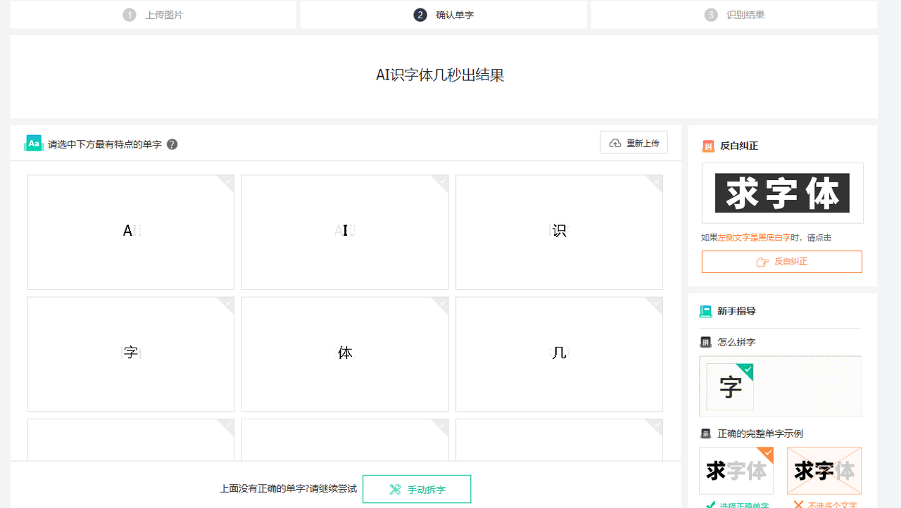 它的操作过程分为了 3 步。第一步是将需要识别字体的图片上传,第二步需要手动选择其中最有特点的单字,提供给求字体网做参考,之后点击 “开始搜索” 按钮,就会开始识别字体了。