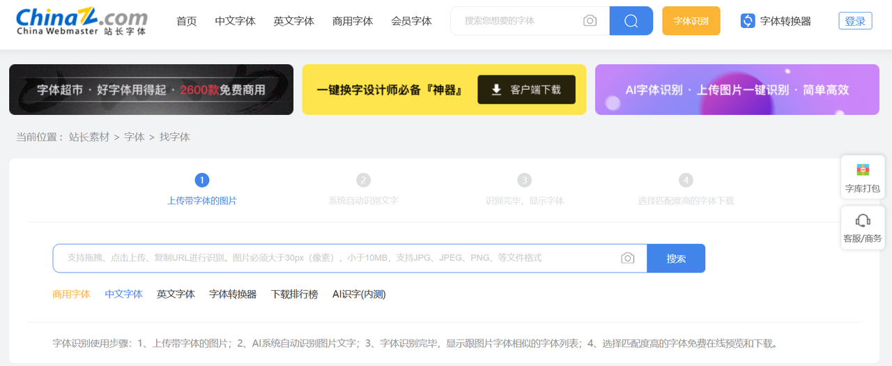 站长素材不仅提供了常用的设计素材,其实也提供了识别字体的入口,这个功能使用起来非常简单,在识别页面,站长素材也给出了使用教程。依照使用步骤操作,很快就会得到理想的字体识别结果。