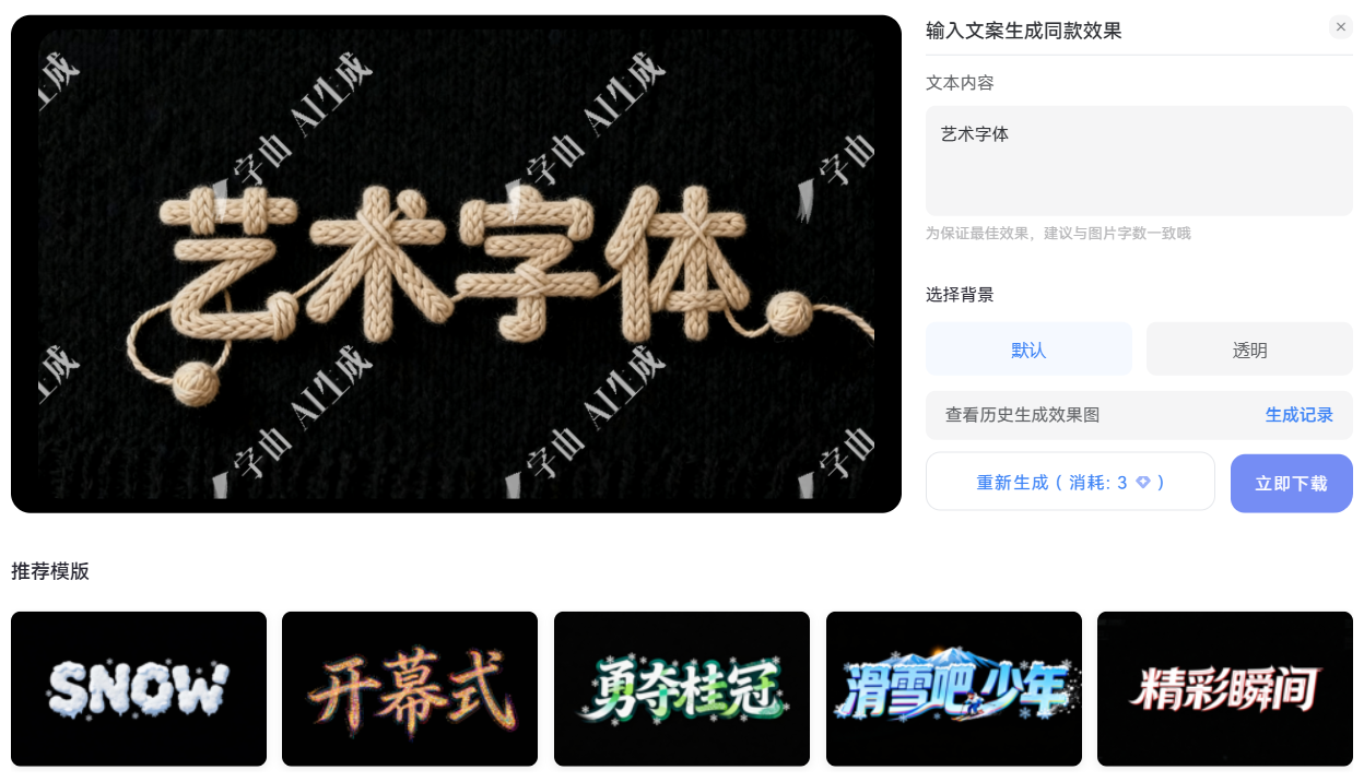 打开字由的 “AI 工具” 之后,可以看到界面中已经提供了丰富的字体卡片。我们可以借助这些字体卡片来一键 “做同款”。字由为这些艺术字卡片提供了 “做同款” 功能,点击按钮之后就能进入字体生成界面,输入好字体文案之后,再点击 “立即生成” 按钮,25 秒左右,就可以在字由中生成艺术字体了。