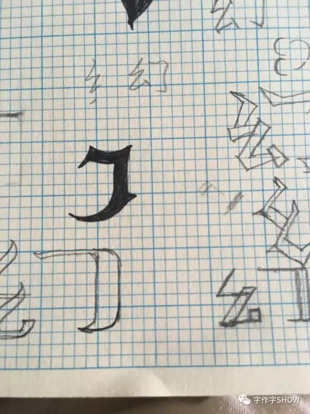3 以字库字体的笔画结构为基础,以提取出来的笔画修饰画出你要表达的字体的效果,可以不用很精确,比如两部分分开画,本例可以有修补的妙招(画精确也有一定的好处:1,可以直观的看到最终的效果。2,上机处理起来更加方便快捷)。画好的草图如下图,很丑吧,那又能怎样,哈哈!