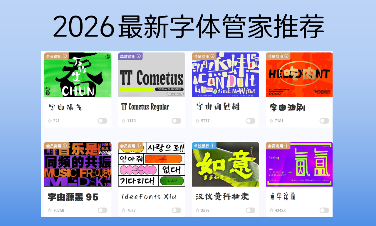 步入2026年,创作赛道越来越卷,效率和合规永远是核心,字体管家早就不是“有字体用就行”,而是要做到找得快、用得顺、商合规、不卡顿,一款好用的字体管家,能直接提升创作效率,省去大量繁琐操作,更能规避掉最头疼的版权风险。选对一款合适的字体管家,把更多时间留给创意和内容,让每一份创作都高效又合规,轻松搞定所有字体需求。