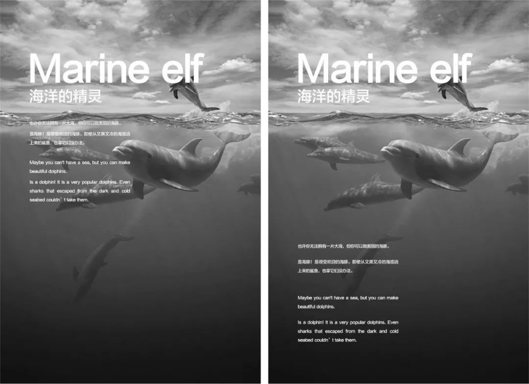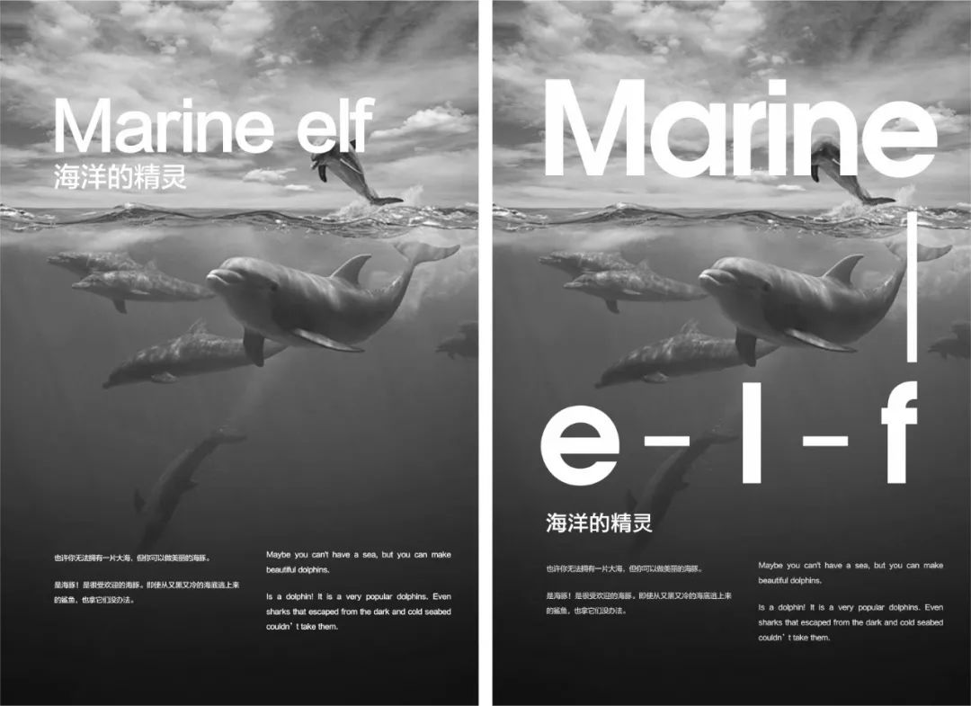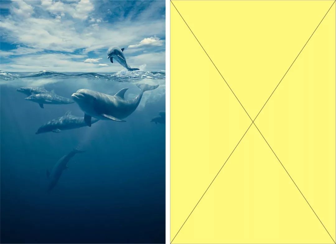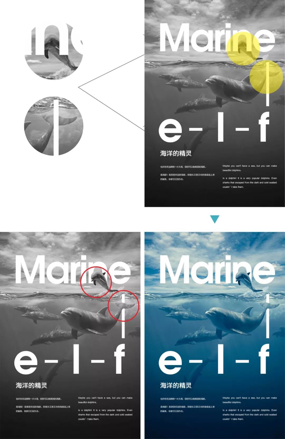 在黄色圆圈标注的位置将海豚的外形勾勒出来,形成一种破图的3D视觉,由此画面的趣味性与互动性更强烈。