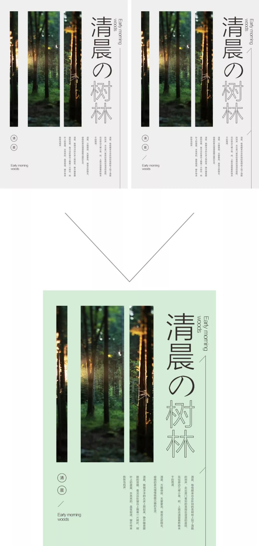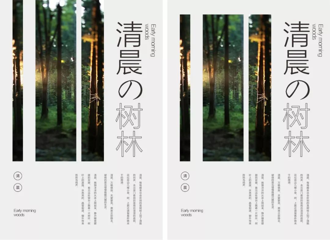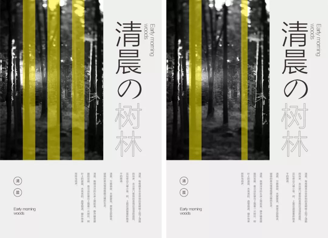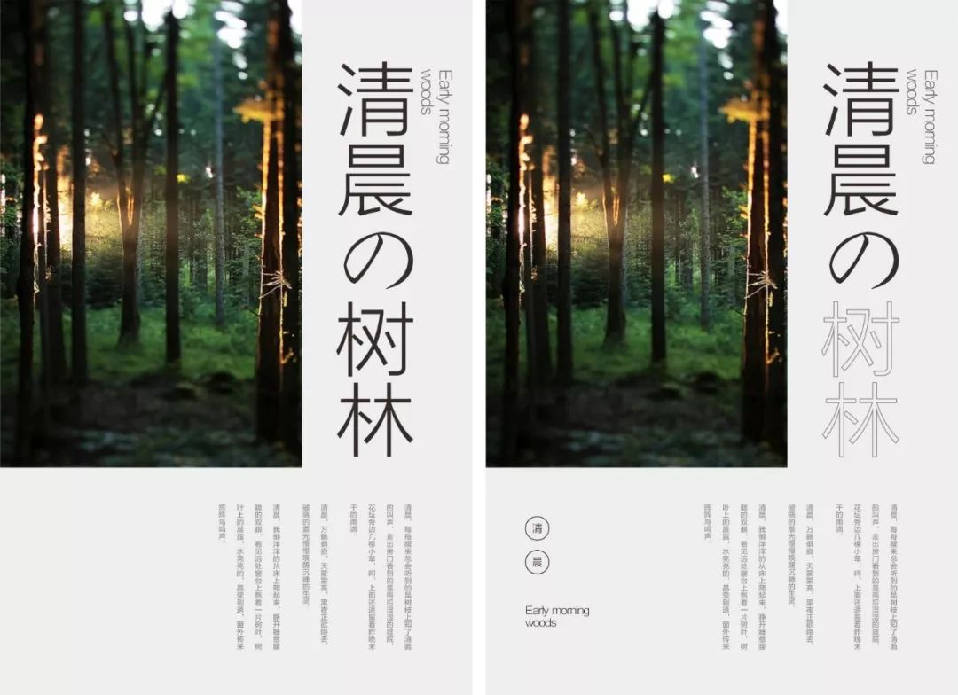 选用一张森林的图片,采用左右构图,显然主标题纵向放置有点单调,可以将“树木”变成线性文字,另外左下角的空白区域,放置关键信息。