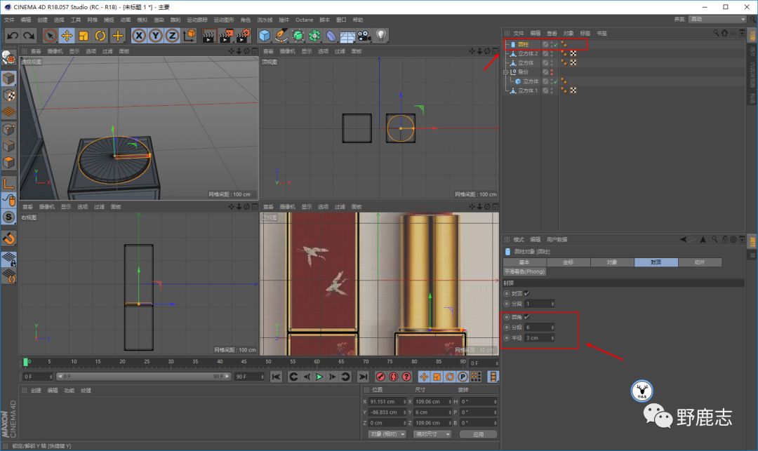 新建一个圆柱体,封顶里勾选圆角,分段和半径以及圆柱体本身的大小,大家都参考着参考图来就好: