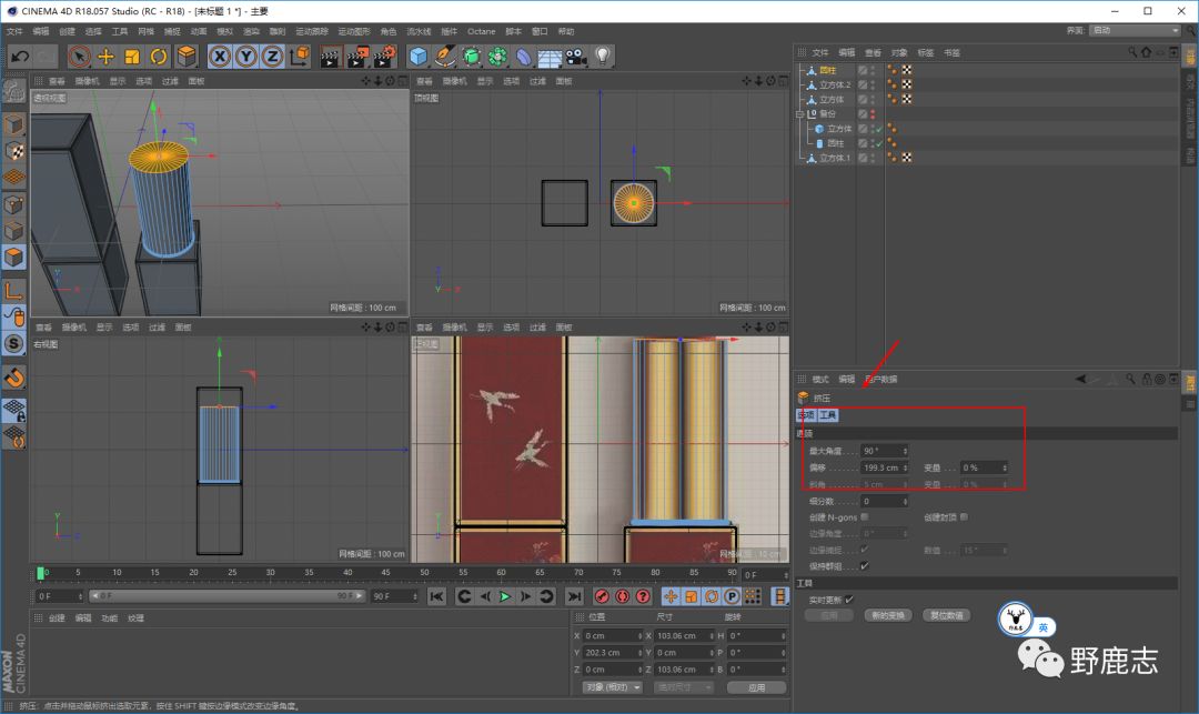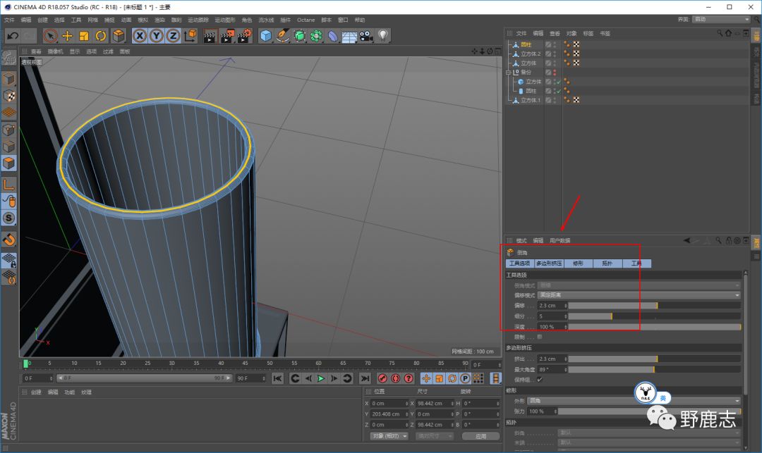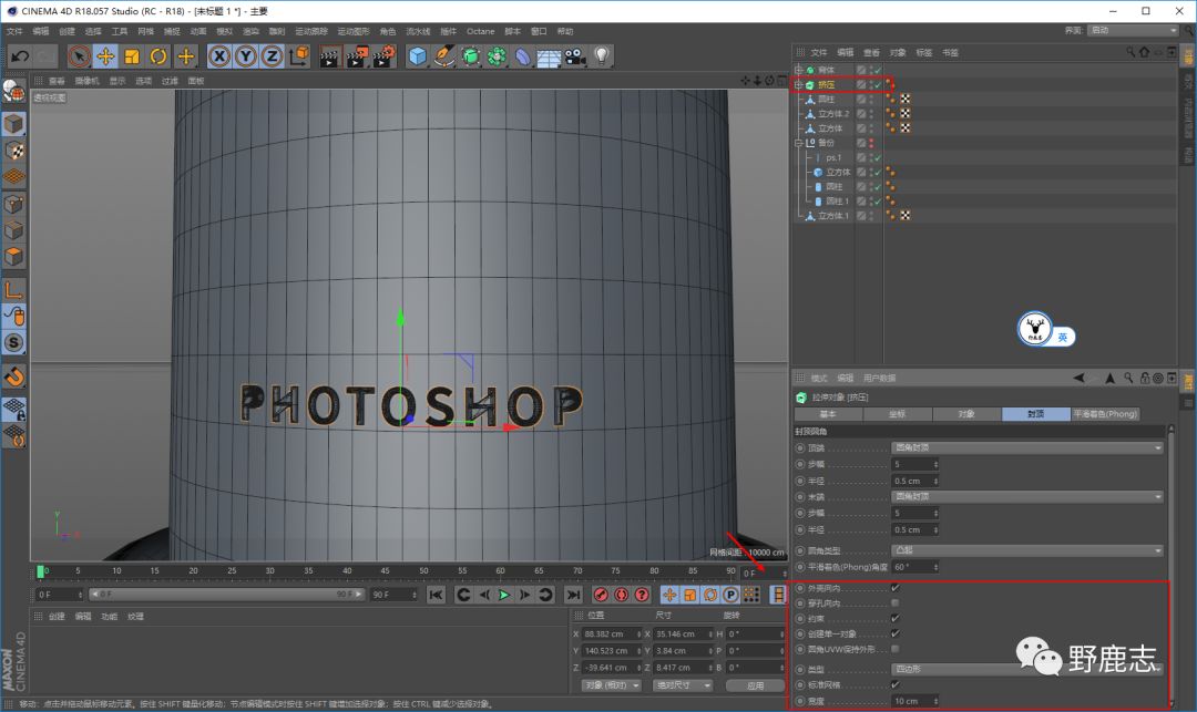 添加挤压,挤压厚度2cm就好,然后添加圆角封底,勾选创建单一对象,类型为四边形,勾选标准网格: