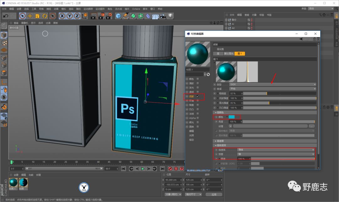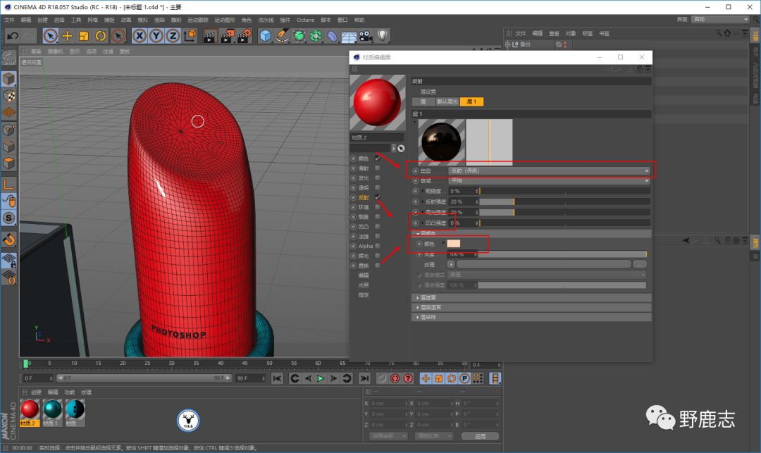 反射通道新建一个传统反射,将层的混合强度以及凹凸强度降低,修改层颜色,其他的参数大家看着效果调整就好: