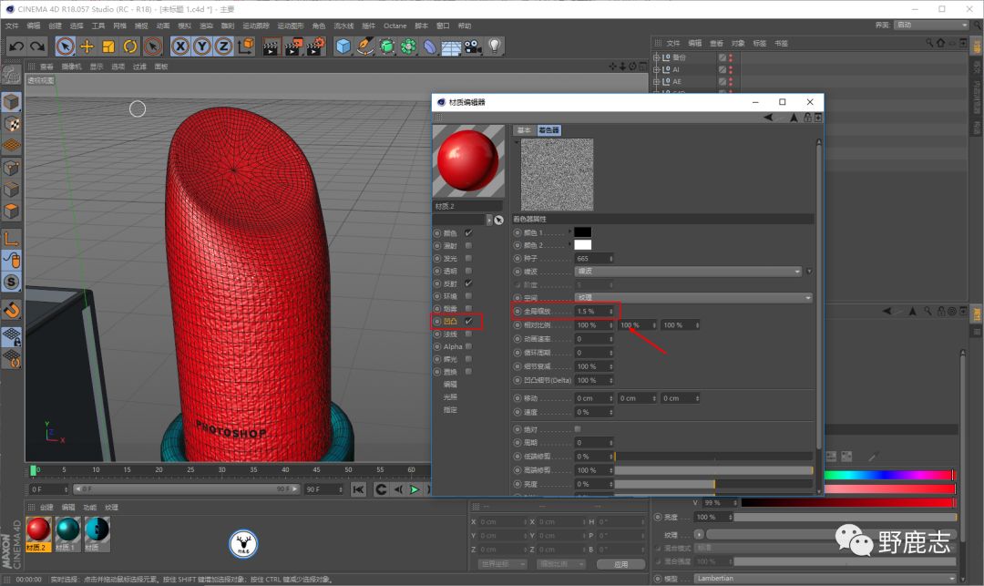 勾选凹凸通道,加载一个噪波贴图,修改全局缩放的数值,这样膏体就有颗粒感了: