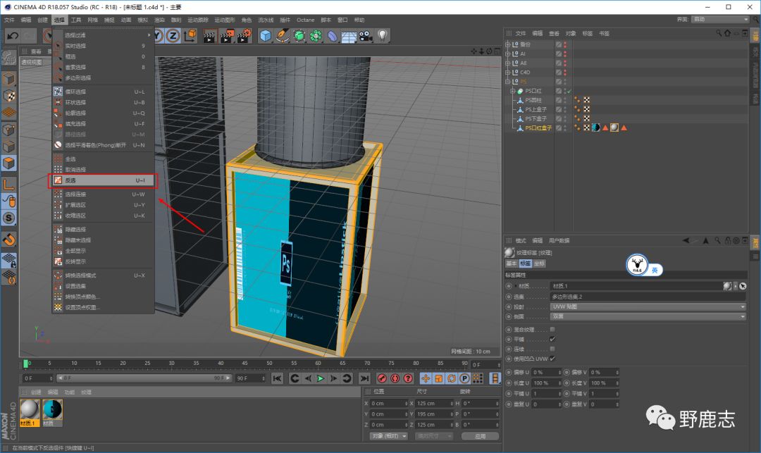 然后在之前选中面的情况下,执行选择-反选,再新建一个材质球,先拖给对象,一会儿我们再来调整材质都可以: