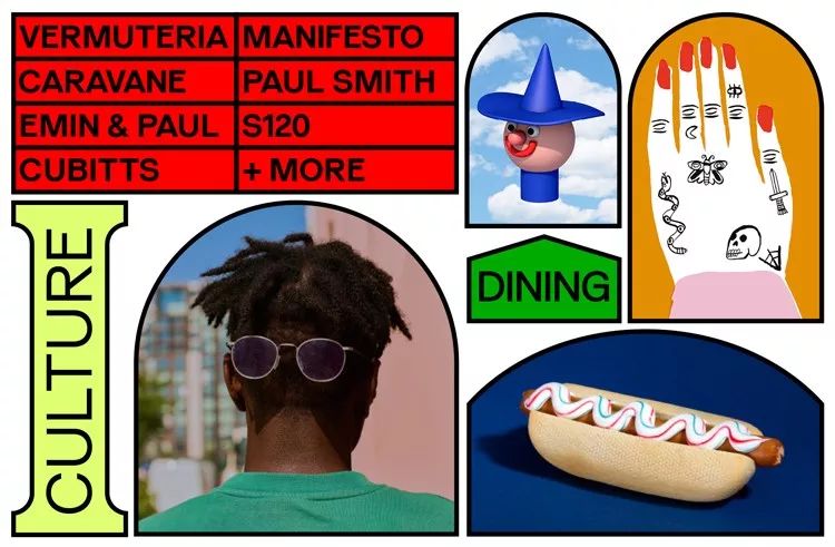 文字和文案保持在最小值,比如品牌名称或活动的三个主要宣传词“商店、餐饮和文化”,但在出现文案的地方,文案也以黑色为背景,用彩色背景包围,然后用黑色勾勒出矩形。