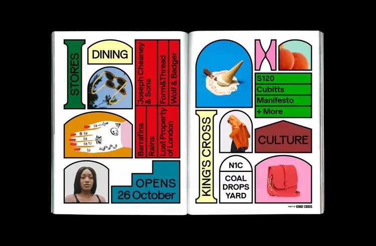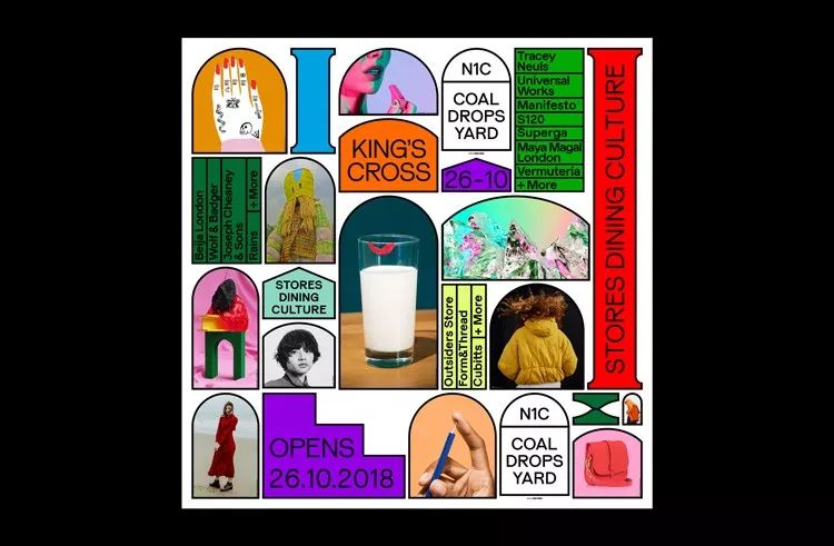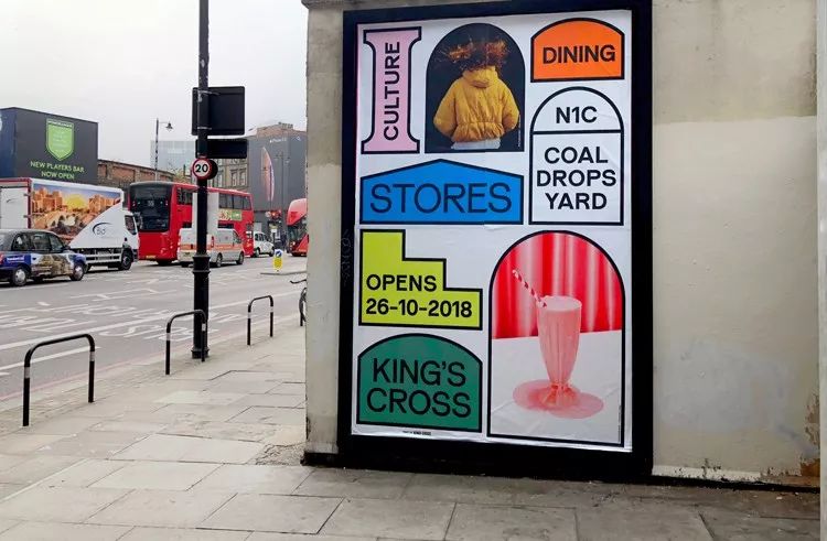 但Coal drop Yard的品牌诉求并非如此。这个新的购物区被Droga5广告公司赋予了一个色彩缤纷、兼收并蓄的品牌形象,这里充斥着各种形状、竖向文字和随意摆置的摄影作品,来表现国王十字车站的“多样性”,同时打破了“企业”购物中心的传统外观。