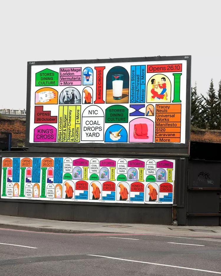 查普曼说,文字和图像在垂直和水平方向上同时出现,这是广告海报上常见的信息结构的离经叛道,目的是让访问者的眼睛“漫游”,而不是给他们一个有指向性的方向。这一设计的目的是为了表现出Coal Drops Yard的布局是鼓励游客去探索,而不是被引导去“硬买”。