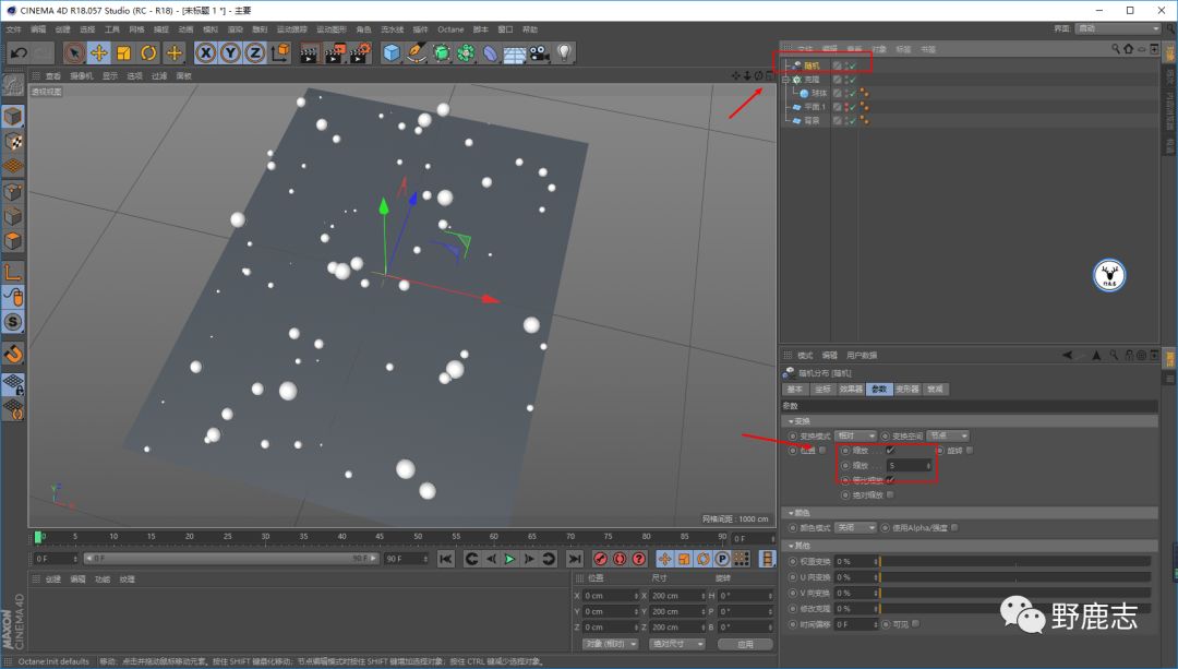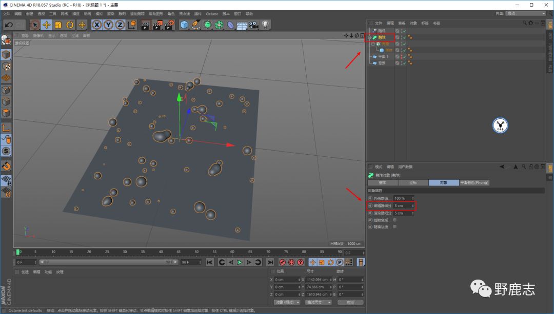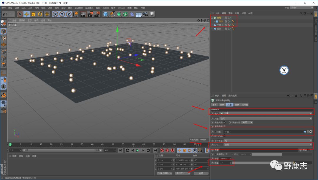 新建球体,调整其大小,然后新建克隆,克隆模式为对象,以复制出来的平面为对象克隆球体。