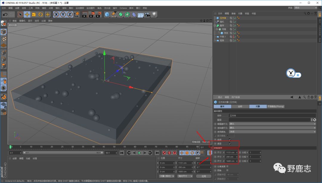 新建一个立方体,尺寸也同样调整到平面一样的尺寸,然后开启透显方便观察: