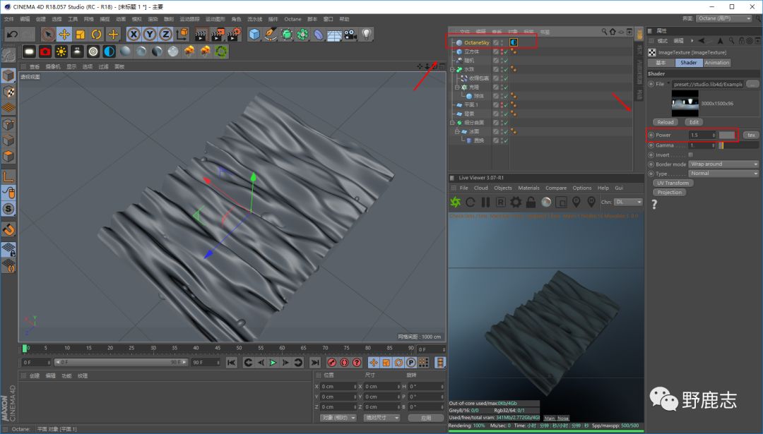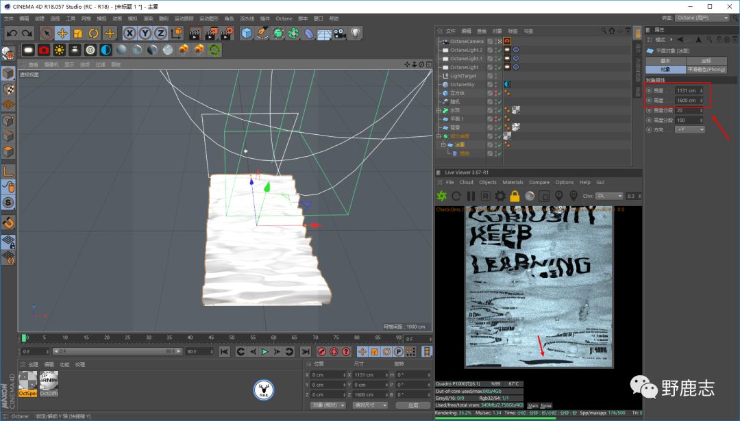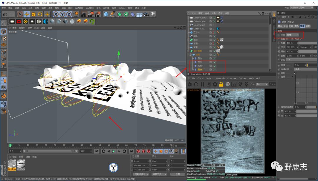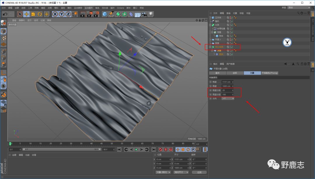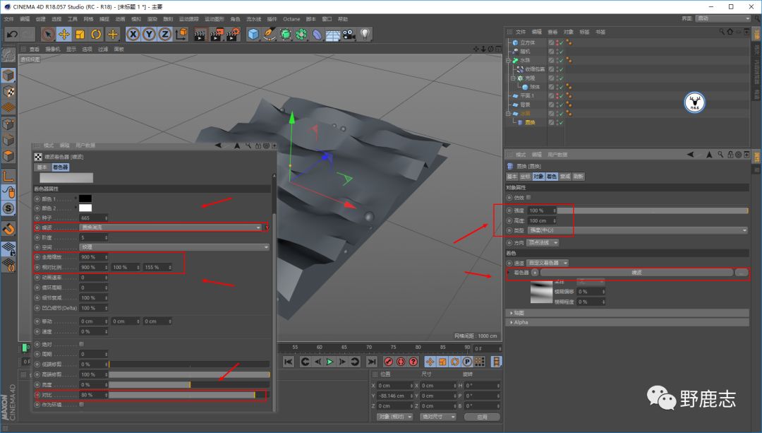 给平面添加置换变形器,着色器里添加噪波,然后通过修改各项参数让平面变成高低起伏类似波浪的形态: