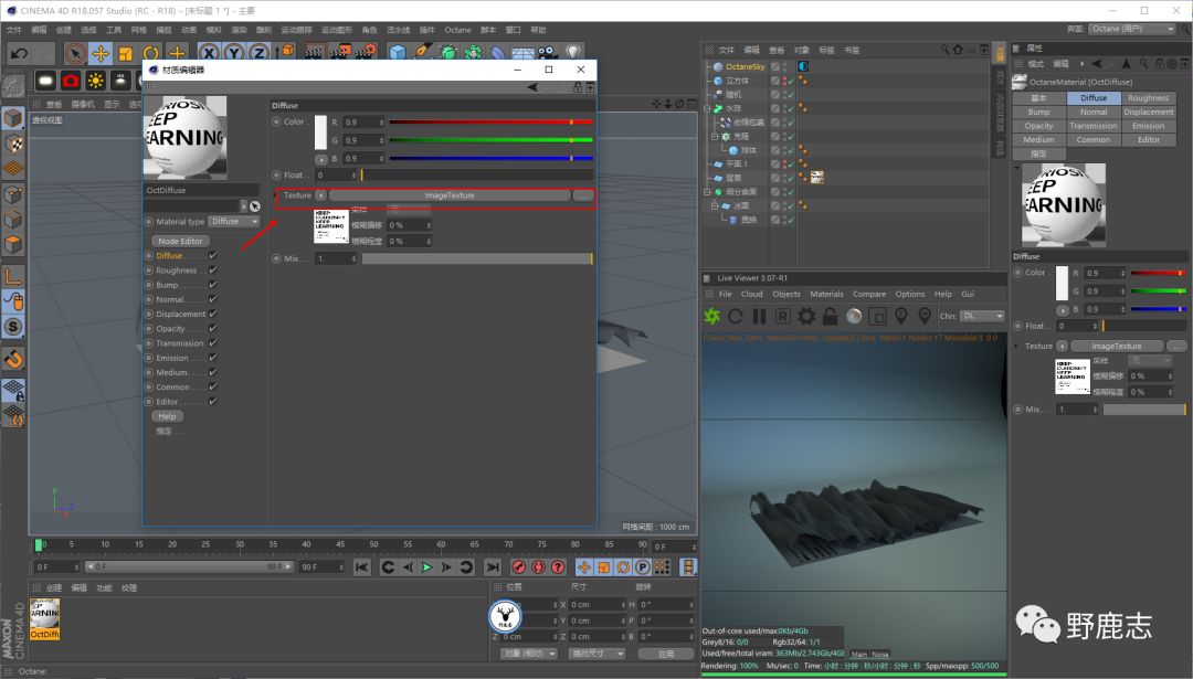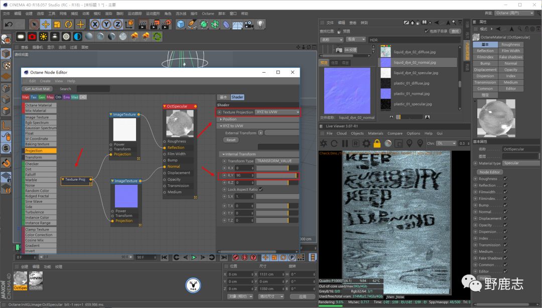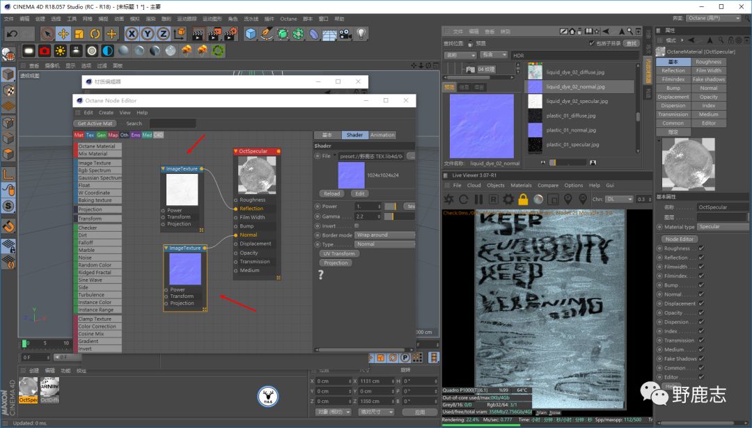 然后节点编辑器中我载入了两张液体纹理贴图,分别贴到Reflection和Normal通道,当然这两张贴图我也会分享给大家: