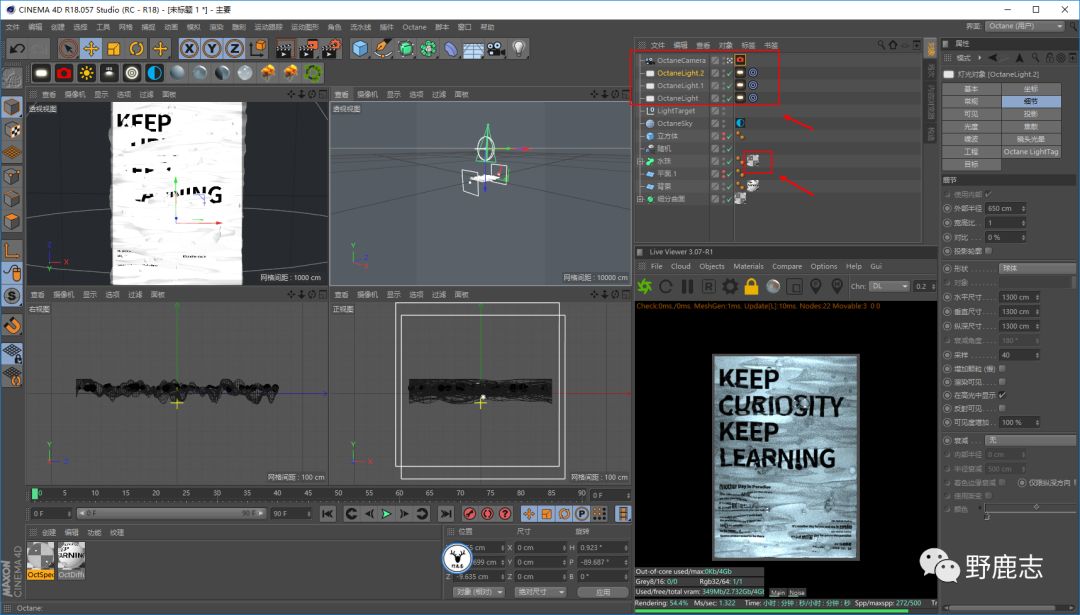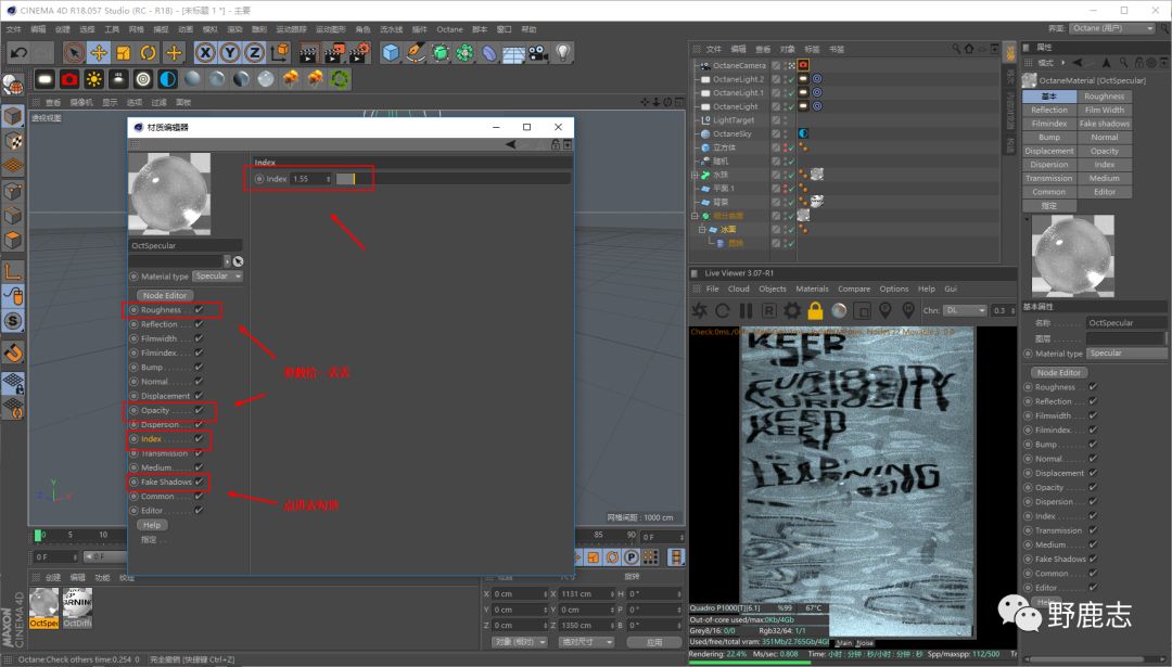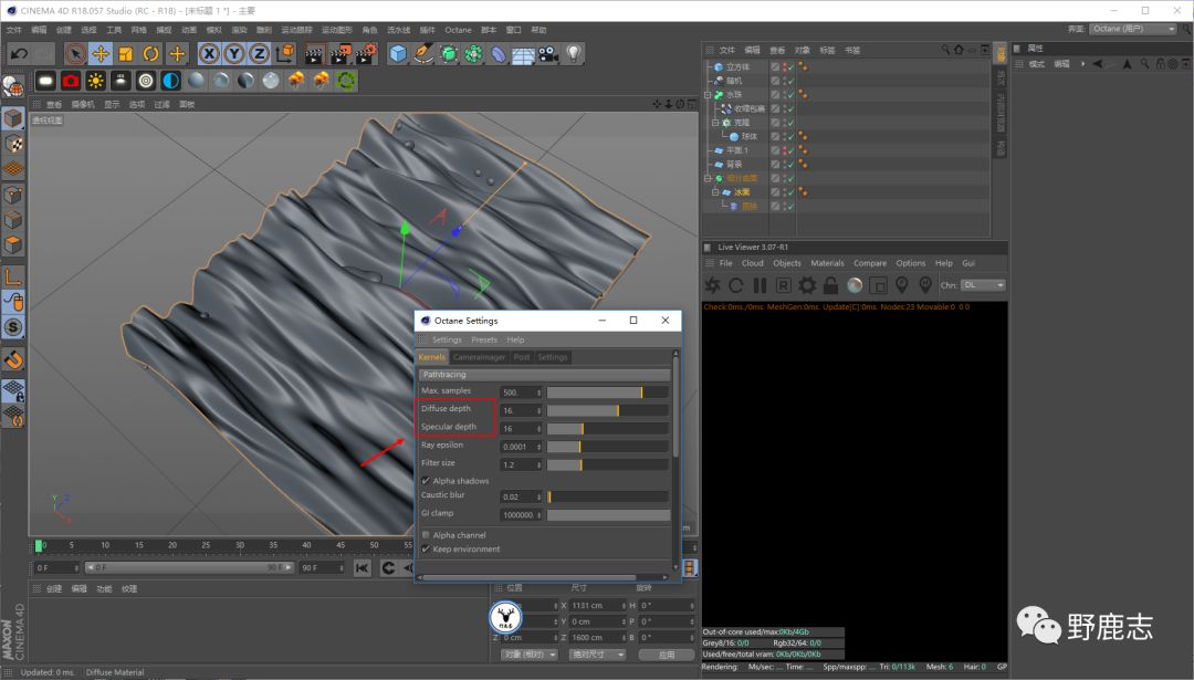我这里还是用的OC渲染,由于后面的材质属于透明材质,所以渲染设置里可以把折射次数提高一下: