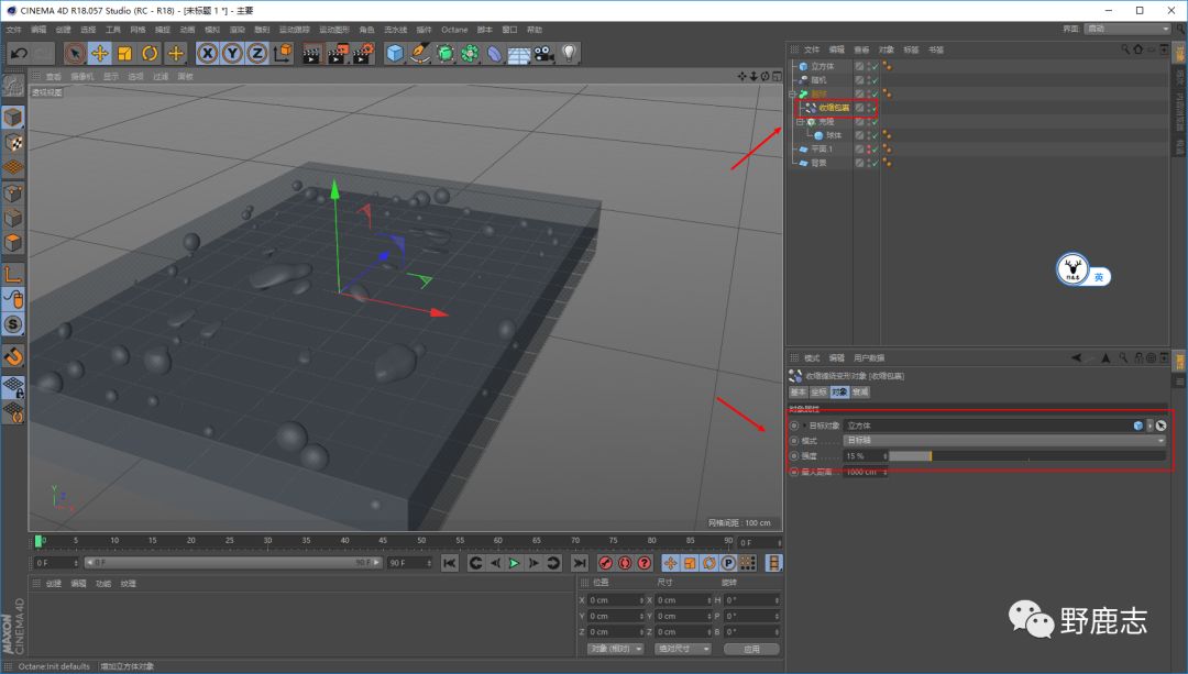 收缩包裹变形器的作用是让对象A以对象B为目标进行包裹变形,这样水珠的形态就更加自然: