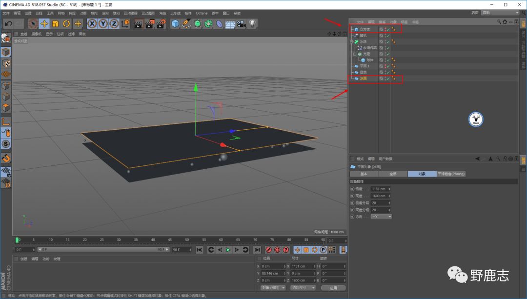 下面制作冰面了,隐藏掉立方体,然后把背景的平面再复制出来一层,放在水珠的上方: