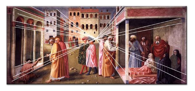 文艺复兴时期的绘画,利用数学原理开发的线性透视,通过叠加线所示
