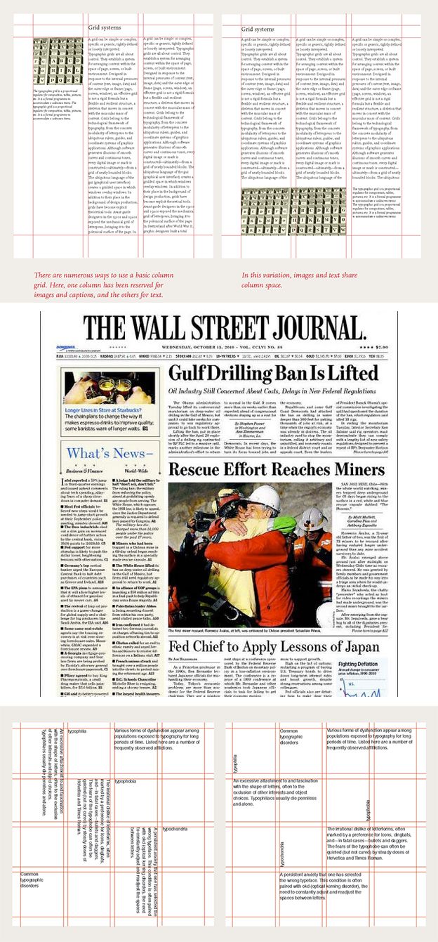 (从上到下):一个多列网格,一个采用主要垂直网格格式的报纸,以及一个模块化网格,展示了这种方法的额外灵活性; 从 Thinking With Type。