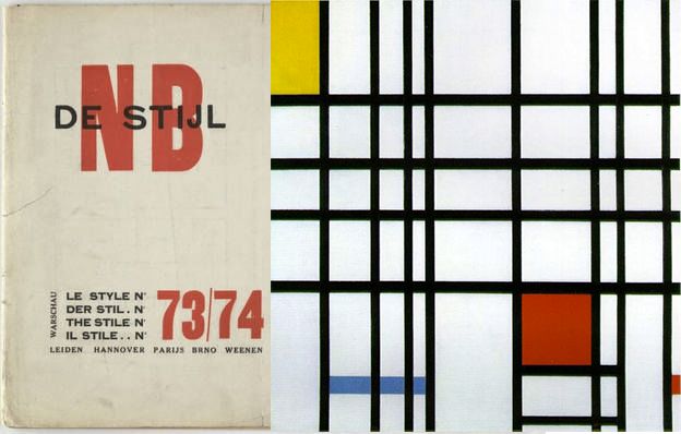De Stijl 出版物(左)和Piet Mondrian(右)的画作,其中网格清晰可见