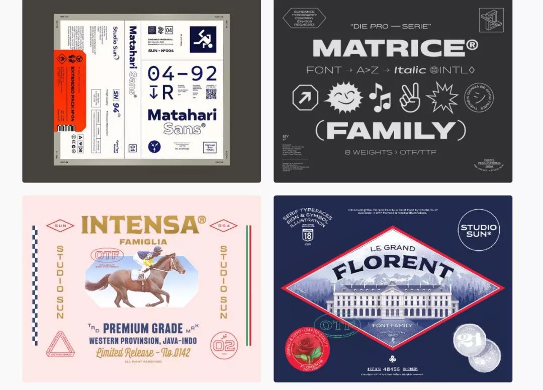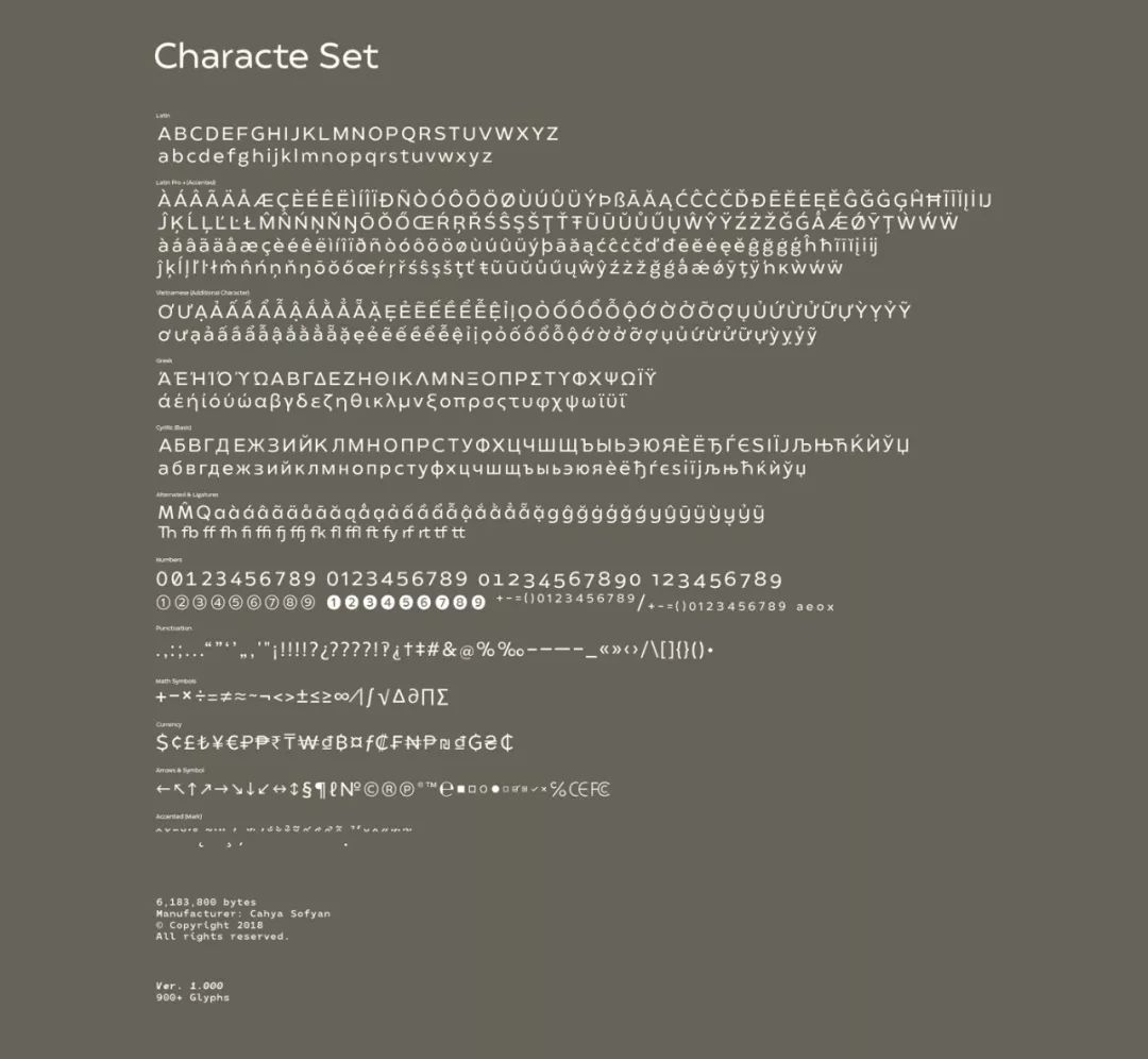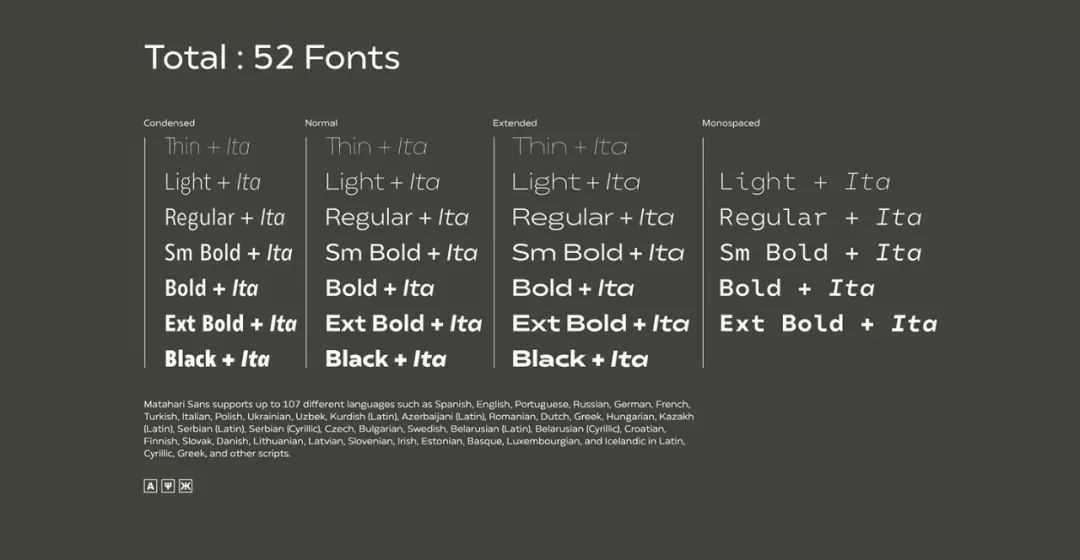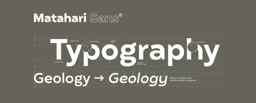Matahari的字体风格参考了Grotesque Font并受Eric Gill的影响,有3个宽度和7个重量,且每个字体都有倾斜的版本,字体使用老式和过渡字母(双层“a”和“g”)。