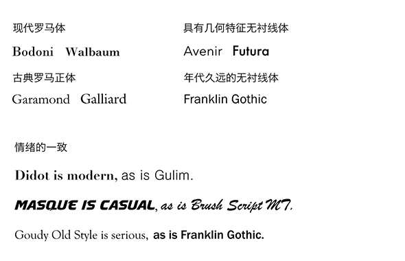 字体搭配总体的原则是一致性加对比性。一致性指的是选择调性和情绪一致的字体。比如现代罗马体搭配几何无衬线体,古典罗马体搭配年代比较久远的无衬线体。字体的情绪表达需要统一,严肃的字体并不适合搭配随意的字体。