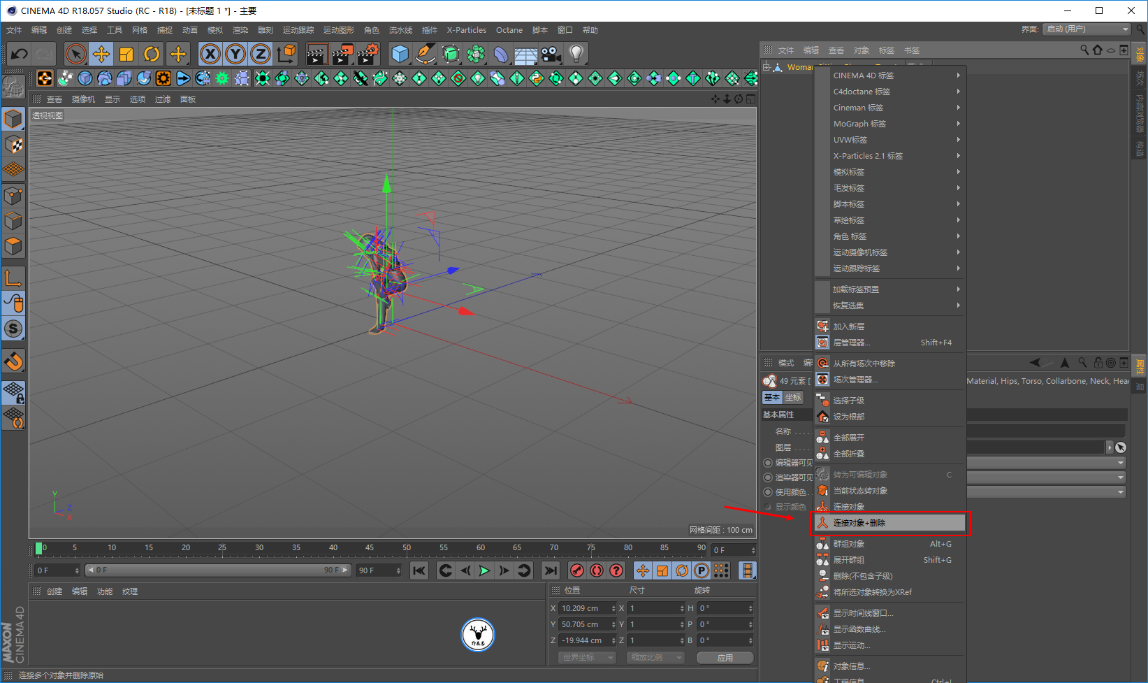简单的对人物模型处理一下,删掉原有的材质,鼠标中间点击全选对象,鼠标右键连接对象加删除:
