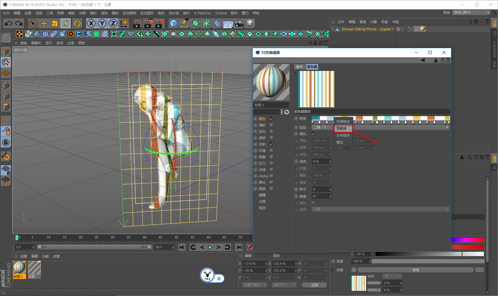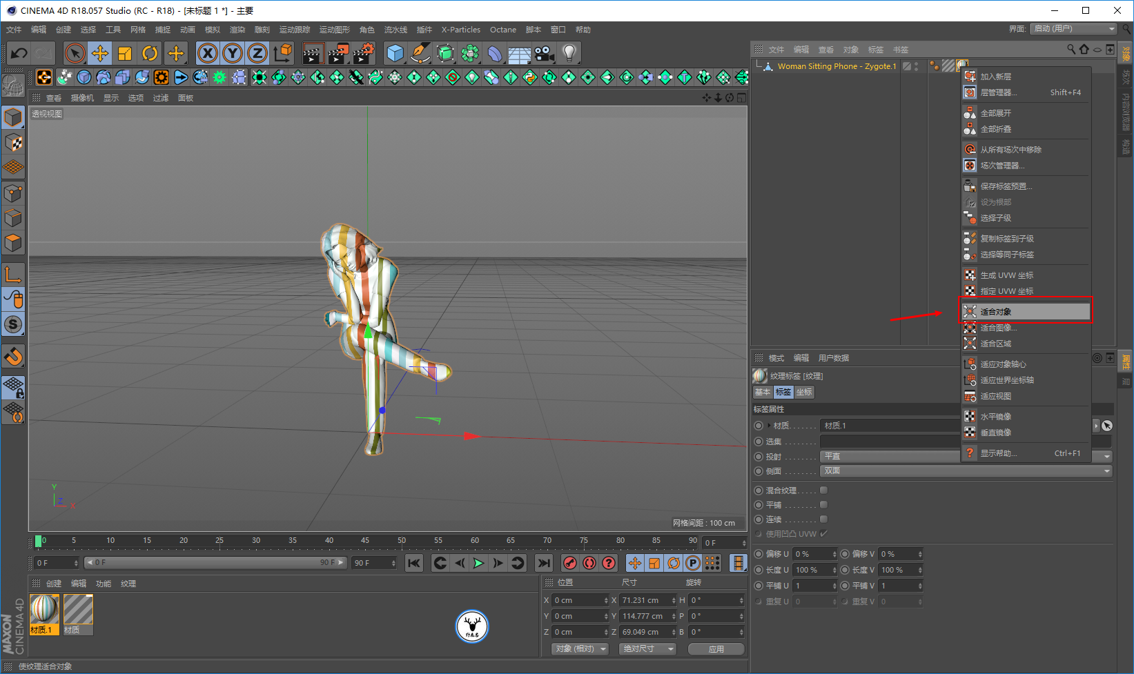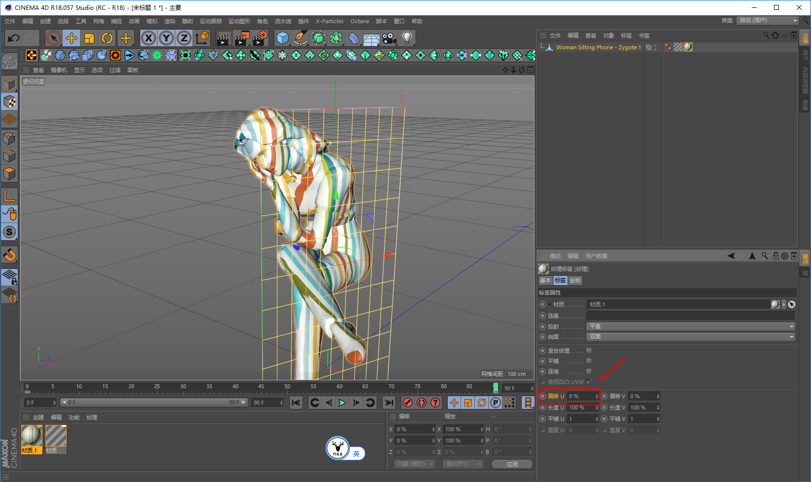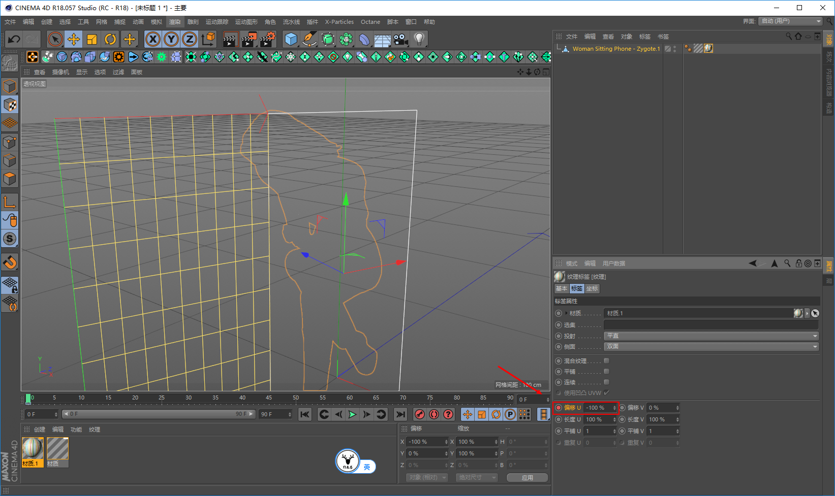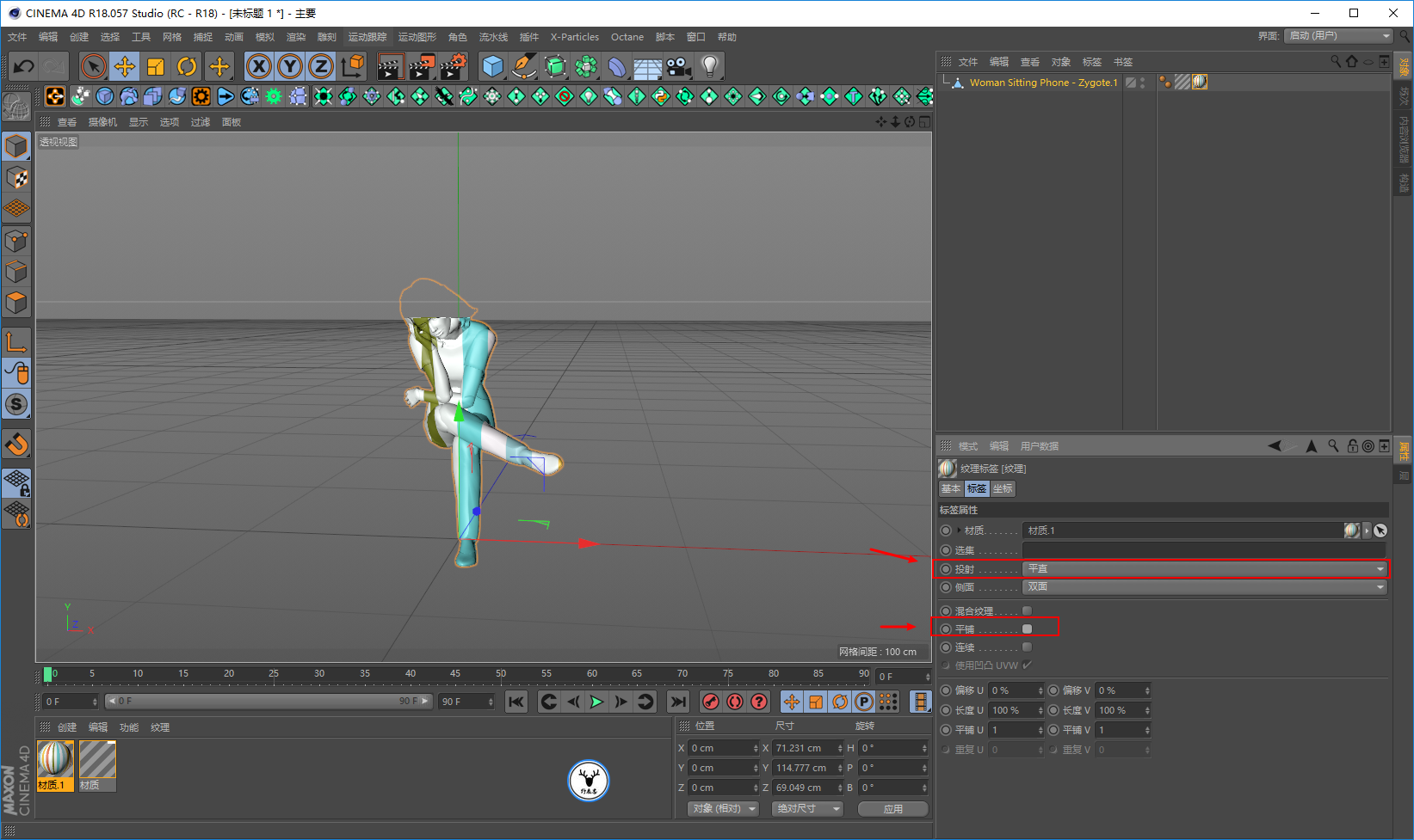 接下来是调整材质的UV了,将平铺的勾去掉,投射方式选择为平直: