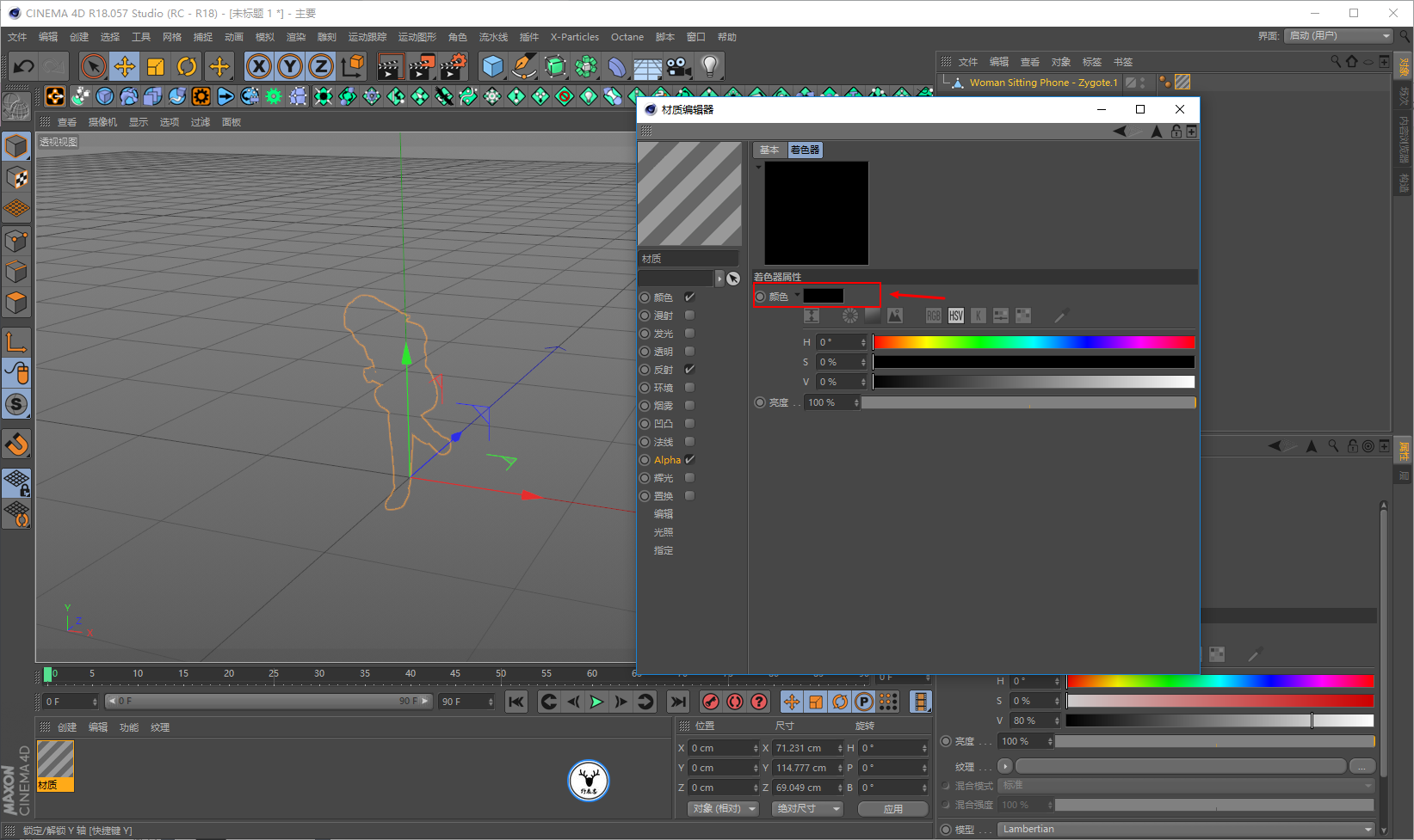 新建材质球,赋予对象以后,勾选Alpha通道,然后添加一个颜色: