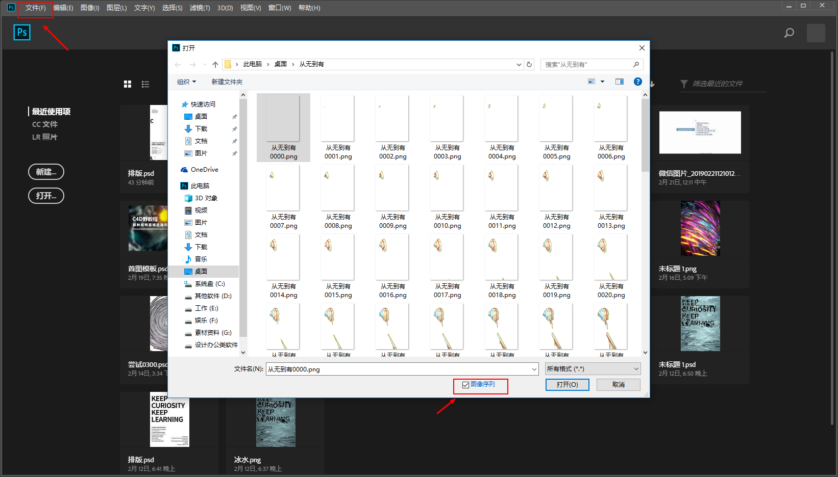 下面就是PS里的操作了,这里简单介绍一下吧,打开PS,在文件里执行打开,然后点击渲染出图的第一个序列图,勾选图像序列: