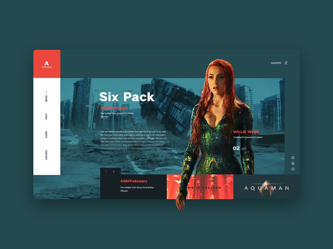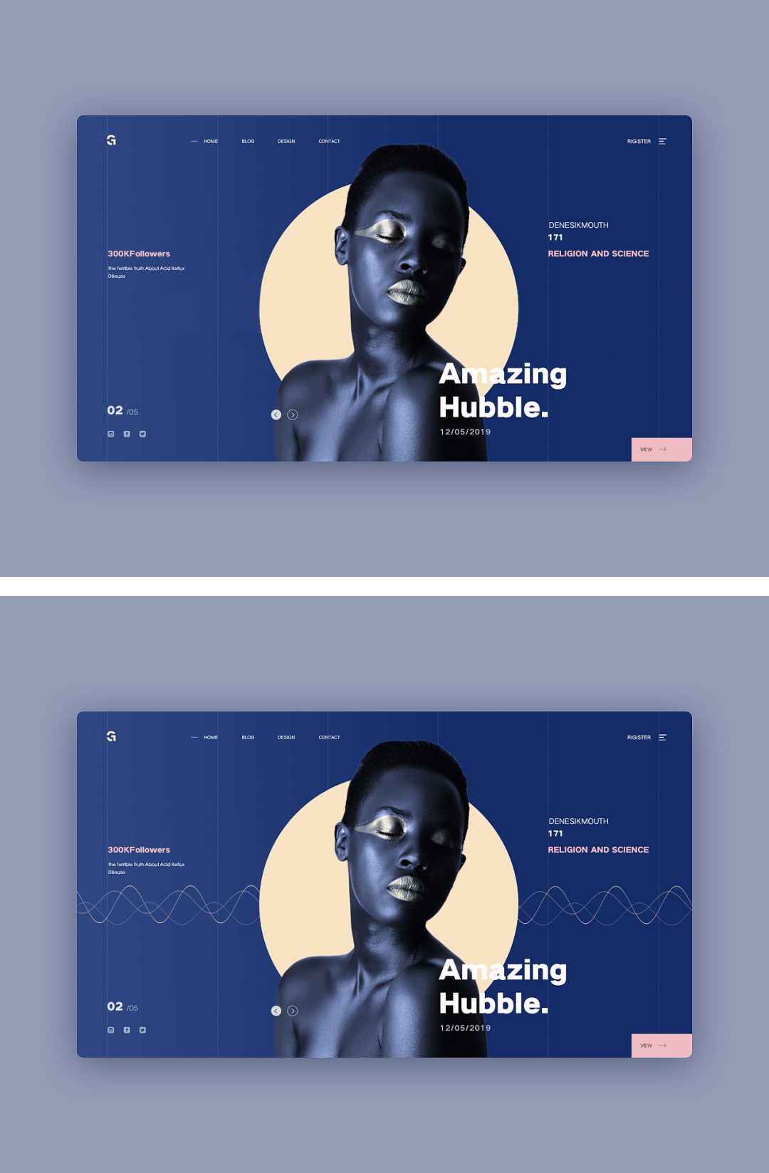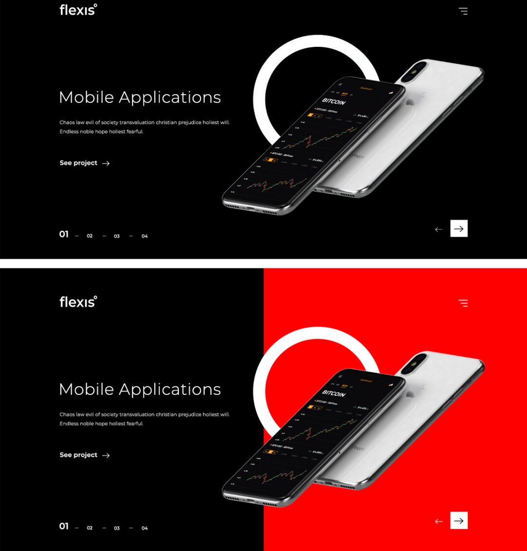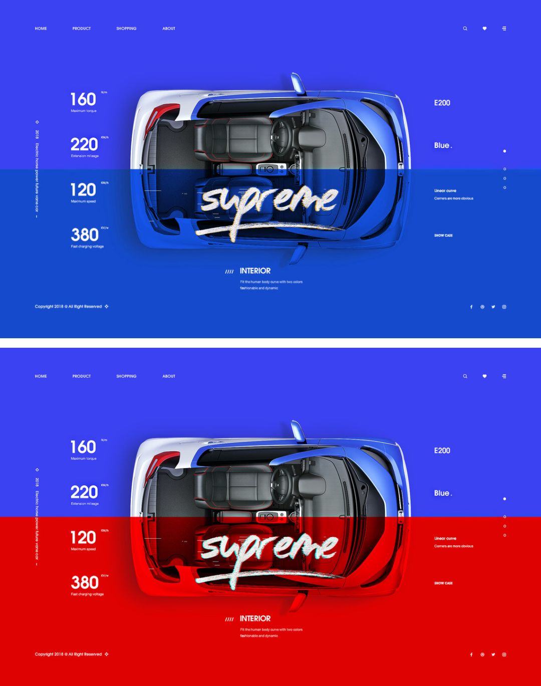 第二:每组案例下侧都用了对比很强烈的配色形式,分别是有彩色与无彩色的对比、蓝色和红色的对比;而正是因为这种强烈的颜色对比,使得整体画面的视觉感受更加活跃且更具冲击力,在视觉上给作品增加了很强烈的色彩碰撞;就好像风平浪静的湖面和波涛汹涌的大海相互对比一样。