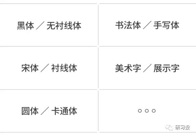 字体的分类其实并没有一个官方的标准,但各种分类方式的基本原则是相同的,这里为了方便理解,将西文与汉字之间具有共通性的字体类别相结合对应,一共大致分为以上五类。