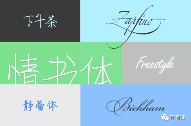 想要让字体传递出亲和力,我们就需要选择具有手写特征的字体,这种字形会更具人文气息。不同的手写字体会呈现出不同的亲和力,笔画轻松自然的手写体用在休闲的情景中较为合适,像西文这种铜版手写体 ⎾ 西文花体 ⏌ 则表现的更加正式与高级。