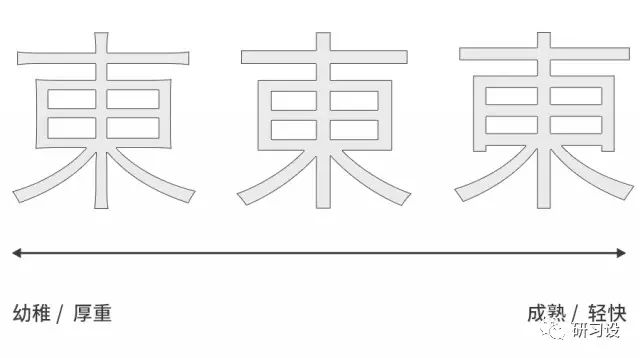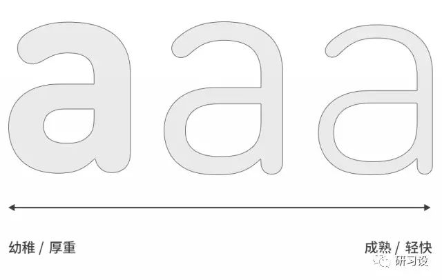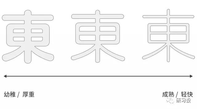 在字体中,同形联想依然存在,中文的圆体是从黑体字逐渐演化而来,结构上继承了黑体的工整大方。笔画的末端圆润,给人易于亲近的印象。随着笔画的粗细变化,字体的气质也会随之变化,粗笔画的圆体字会呈现出儿童与幼稚的印象,笔画越细,则会越显成熟。