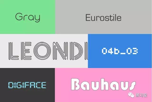 西文相对于中文来说,笔画更加简单,我们选用几何造型强烈的展示性字体同样能够表现出未来与先进的印象。这里需要注意的是,文字的造型越倾向于图形化,辨识度也就会随之降低。所以在使用这类字体时需要格外谨慎,它仅适用于标题或版面中的主形象等场景。