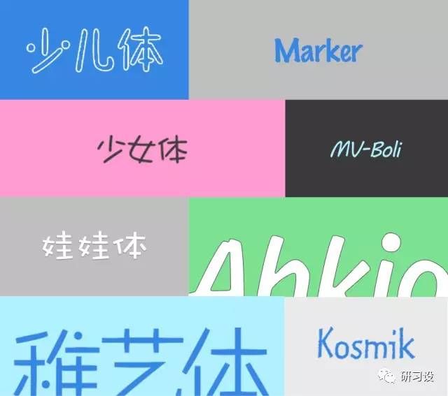 针对表现儿童的字体,他们的共同点都是具有手写的特征,而在笔画末端多数呈现圆滑的形状。这里需要注意的是,我们不能根据自己的喜好而随意应用儿童体,对于青春期的少女或者表现小孩时,我们使用儿童体并不会有什么问题,但是如果出现在政府的对外形象或本应体现端庄的场景,就不是那么合适了。
