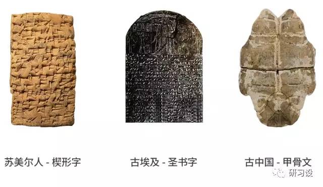 文字是人类文明发展的重要标志,其演变见证并记录了世界的文明发展历程。下图展示的是几种古老的文字发展源头,它们分别是苏美尔人的楔形字、古埃及的圣书字以及古中国的甲骨文。了解文字的演变过程,会更有助于我们接下来的讲解。