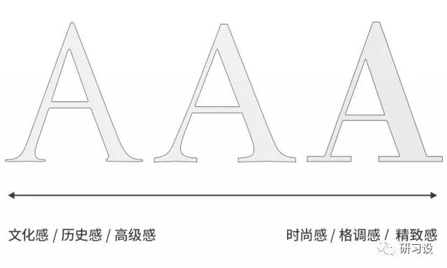 衬线体中,带有手工感的老式衬线体,适合表现文化与历史感;现代型衬线体,笔画呈几何结构,适合表现时尚与高格调的印象;处于两者之间的是过渡型衬线体,是常用于正文与标题的通用性字形。(如继续细分,可以分为老式衬线/复古衬线/过渡衬线/现代衬线/粗衬线)