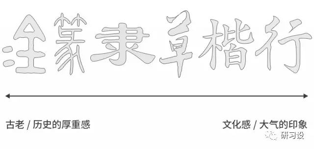 中国的汉字起初由雕刻在龟甲与牛骨之上的甲骨文逐渐演变到雕刻于钟鼎上的金文,又从金文演变成为大篆小篆,而隶变的发生是古今汉字的分水岭,它是篆书为了解决快速书写的需求而逐渐简化形成的。又从隶书的快速书写的过程中形成了草书,草书经过楷化,更加规范和端正,而行书介于草书与楷书之间,弥补了楷书书写速度过慢和草书不易识别的问题。在选择书法字时,需要与所传达的项目背景相对应。越古老的文字,其历史感越强。