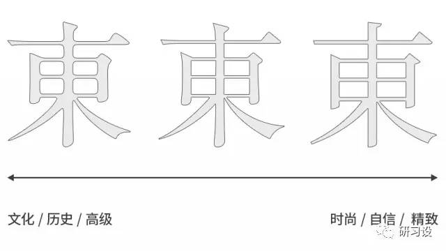在汉字的宋体字中,老式宋体的笔画结构带有手工雕刻的痕迹,中宫较小,重心偏高,适合表现文化与历史相关的情境,又因为这种历史感,会给人传统、正统与高格调的印象,所以也能传递出高级感;而现代宋体笔画呈几何化结构,相对于老式宋体的温情,现代宋体更加的冷峻,具有时尚感与精致的印象;处于两者之间的中间型宋体,同时具有两者的优缺点,是现今比较通用的宋体字形。