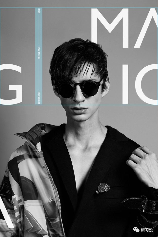 接下来我们将选择好的照片与字体进行组合搭配,除字体与照片的选择之外,在排版形式上也需要偏向现代感。这里为了让画面显得更丰富,将字母拆解后置入到版面中,并做出血处理。而出血之外的部分会重复的出现在版面中,以体现数码风格的这种特性。版面中C与G的外观轮廓极为相似,只需要将G的特征部位裁切掉就可以识别成字母C,而左下角的斜线并不具备识别性。它仅作为与上方图形呼应的补充。