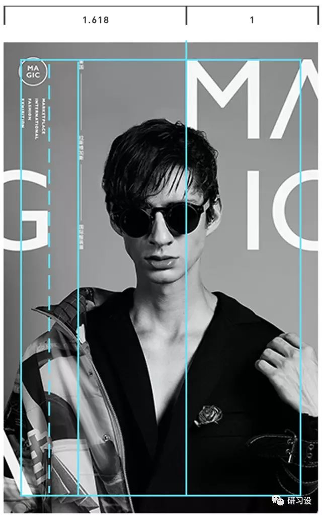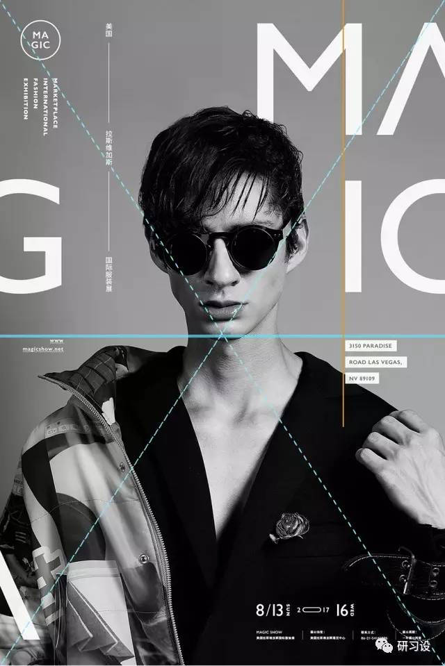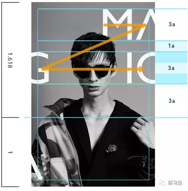 主标题的位置与比例大致确定好以后,我们可以借助一些美学比例来微调版面中元素的位置关系。这里文字虽然是以散布的形式出现,但基本的Z型视线引导原则还是需要遵守的,也就是说,字距需要小于行距,并以从左上到右下的阅读逻辑来编排文字元素。