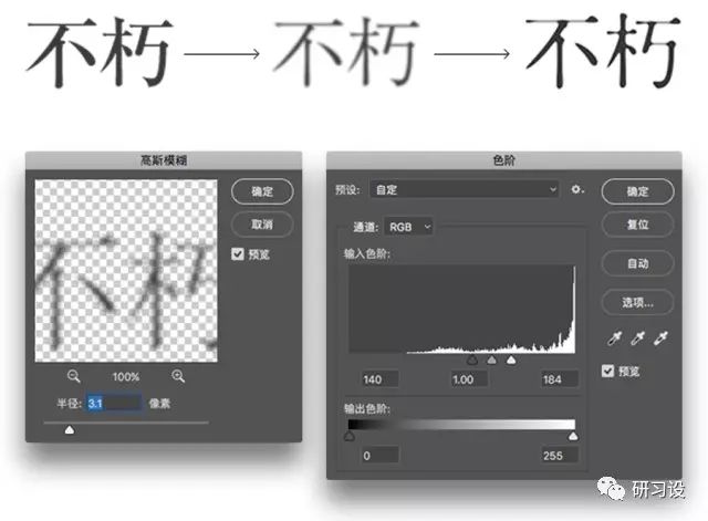 可以使用简单的方式实现这个效果,大致思路是将字体通过高斯模糊命令处理成虚化的状态,并在文字底部合并白底色图层,再通过色阶命令来调整黑与白之间的关系,以达到最佳效果。