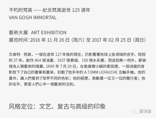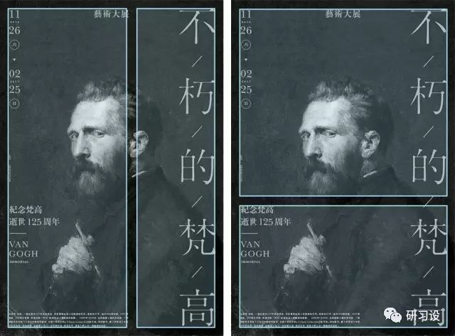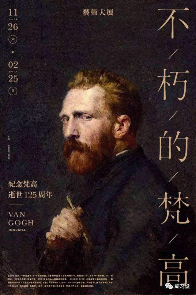 主题名称是“不朽的梵高”从语义来说,这是一个需要表现复古与文艺的印象,我们选择老式风格的宋体字形作为基础,为了更好的传递这个概念,我们可以进一步刻画主标题,将它处理成经岁月侵蚀而残缺的外形。使其更加接近图形的印象,创建记忆点。