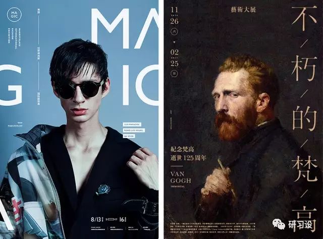 将处理好后的主标题置入到版面中,并根据图像本身的内容来决定文字编排的位置与形式,这里我们将主标题文字竖排摆放在版面的右侧。梵高是巴洛克时期的代表画家,我们可以选择巴洛克时期的过渡型西文字体来与版面搭配。接下来我们加入二级文字信息,这里需要注意的是,文字组合与人物的呼应关系。