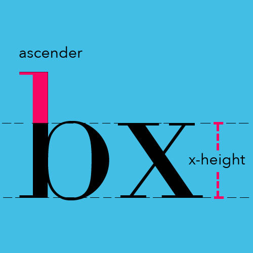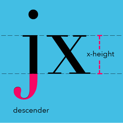 x 高度以上的部分被成为上伸部,以下的部分被称为下伸部。上伸部和下伸部的高度决定了字母是否比例均衡。